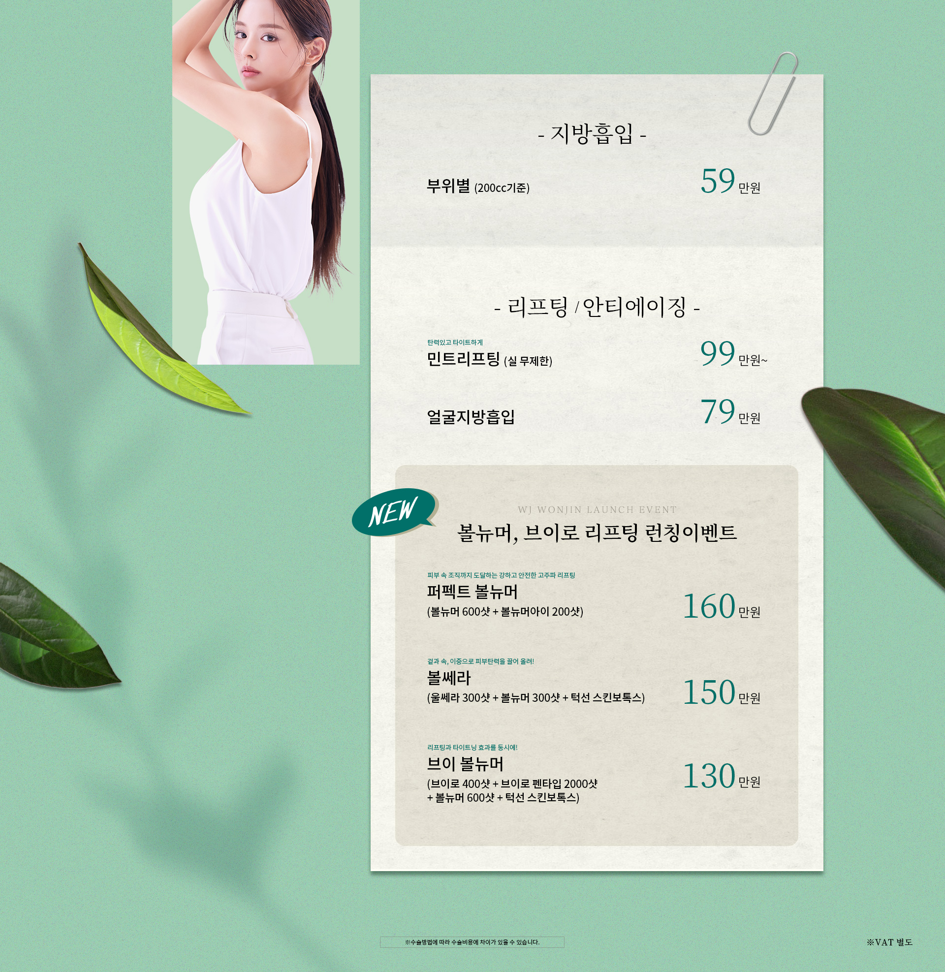 수많은 셀럽들이 거쳐간 WJ원진성형외과, 그들이 선택한 성형수술만 모아 놓은 특가 이벤트를 지금 바로 확인해 보세요. 놓칠 수 없는 혜택 그리고 예뻐질 수 있는 절호의 기회