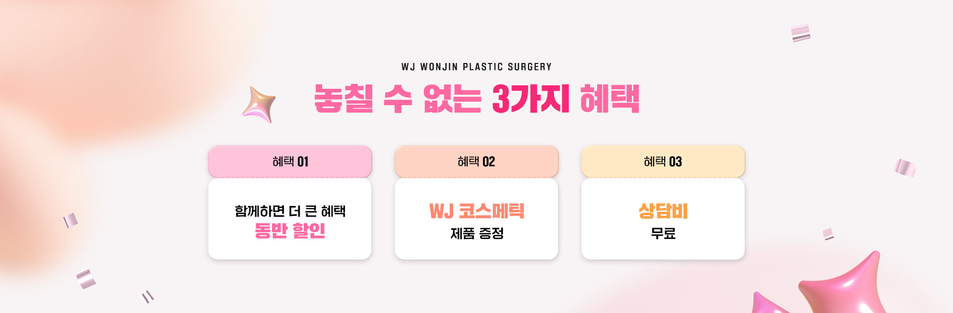 수많은 셀럽들이 거쳐간 WJ원진성형외과, 그들이 선택한 성형수술만 모아 놓은 특가 이벤트를 지금 바로 확인해 보세요. 놓칠 수 없는 혜택 그리고 예뻐질 수 있는 절호의 기회
