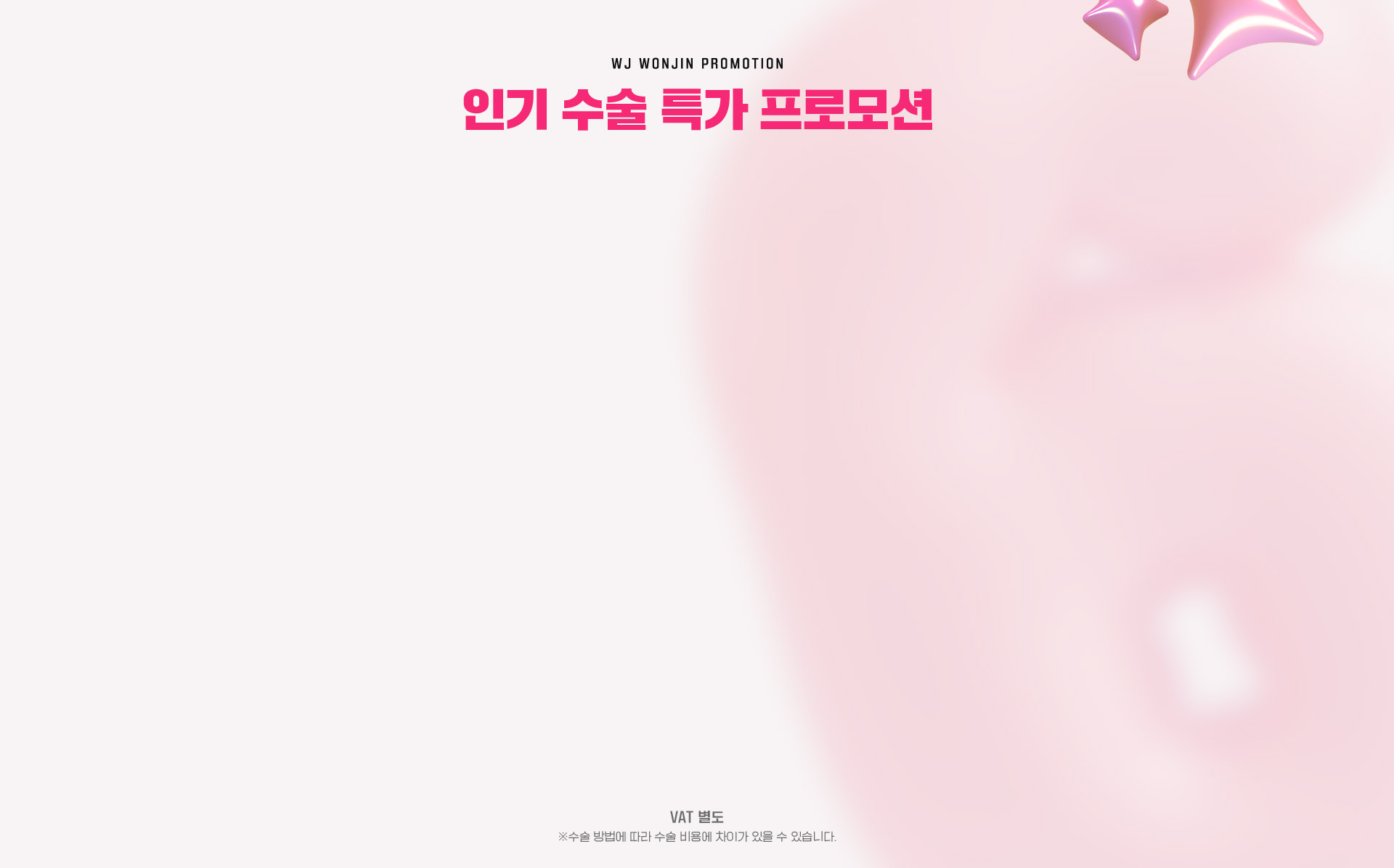 수많은 셀럽들이 거쳐간 WJ원진성형외과, 그들이 선택한 성형수술만 모아 놓은 특가 이벤트를 지금 바로 확인해 보세요. 놓칠 수 없는 혜택 그리고 예뻐질 수 있는 절호의 기회